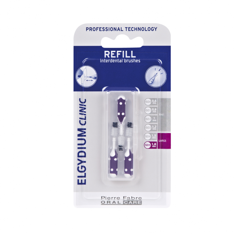 ESCOVILHÕES ELGYDIUM CLINIC ESCOVILHÕES RECARGAS adaptam-se aos cabos dos modelos ELGYDIUM CLINIC TRIO COMPACT e ELGYDIUM CLINIC FLEX. Estão disponíveis em 4 tamanhos. Cada tamanho tem uma cor correspondente, com diâmetro de arame específico (entre 0,38 e 0,80 mm) e diâmetro de cerdas específico (entre 1,9 e 8 mm) para se adaptar a todos os tamanhos dos espaços interdentários.Têm ainda cerdas bicolores: brancas para revelar as gengivas sensíveis em caso de sangramento, e pretas, mais finas, para facilitar a inserção da escova e visualizar a eliminação da placa bacteriana.