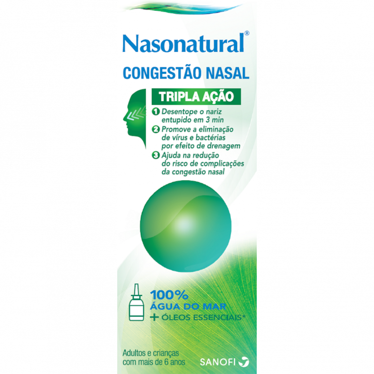 Nasonatural Congestão Nasal é composto por 100% água do mar e tem uma tripla ação: • Desentope o nariz em menos de 3 minutos através de uma ação osmótica natural. • Promove a eliminação de vírus e bactérias por ação mecânica de drenagem das fossas nasais. • Ajuda na redução do risco de complicações da congestão nasal. A utilização de Nasonatural Congestão Nasal - Tripla Ação (adultos e crianças a partir dos 6 anos) permite desentupir o nariz por ação osmótica e, consequentemente, promove a eliminação de vírus e bactérias por efeito de drenagem e ajuda na redução do risco de complicações da congestão nasal. Pode ser utilizado por adultos e crianças a partir dos 6 anos. Não está indicado em gravidez, aleitamento e crianças com idade inferior a 6 anos.