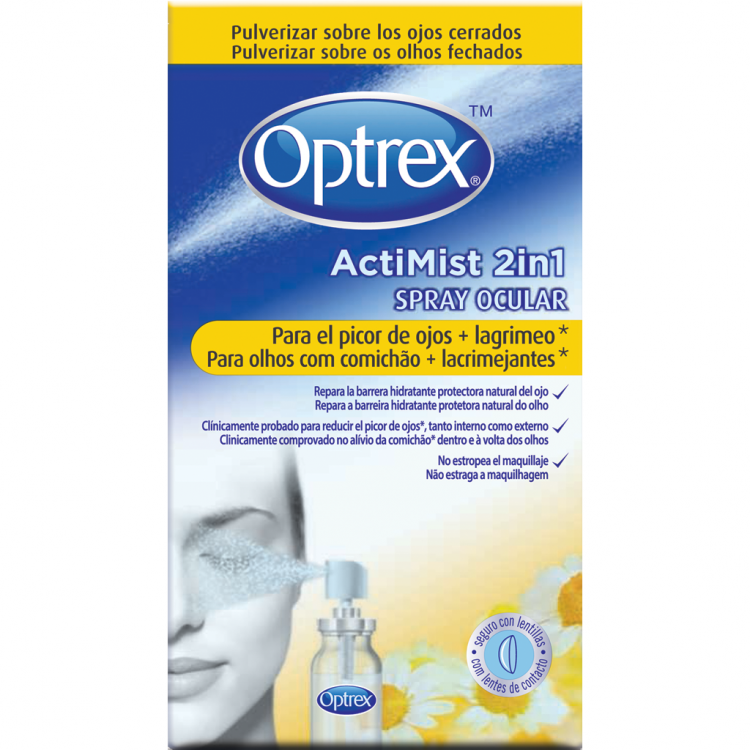 Optrex ActiMist 2in1 Spray Olhos com Comichão e Lacrimejantes repara a barreira hidratante protetora natural do olho. Refresca, acalma e alivia o olho. É rápido e fácil de utilizar, não havendo a necessidade de tocar nos olhos. Alivia a comichão tanto den