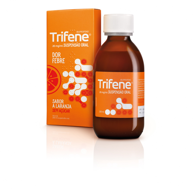 TRIFENE® Suspensão oral contém 20mg/ml de ibuprofeno como substância ativa. Alivia a dor ligeira a moderada e faz baixar a febre. Está indicado para crianças a partir dos 3 meses de idade ou peso corporal acima dos 5Kg, adolescentes e adultos.